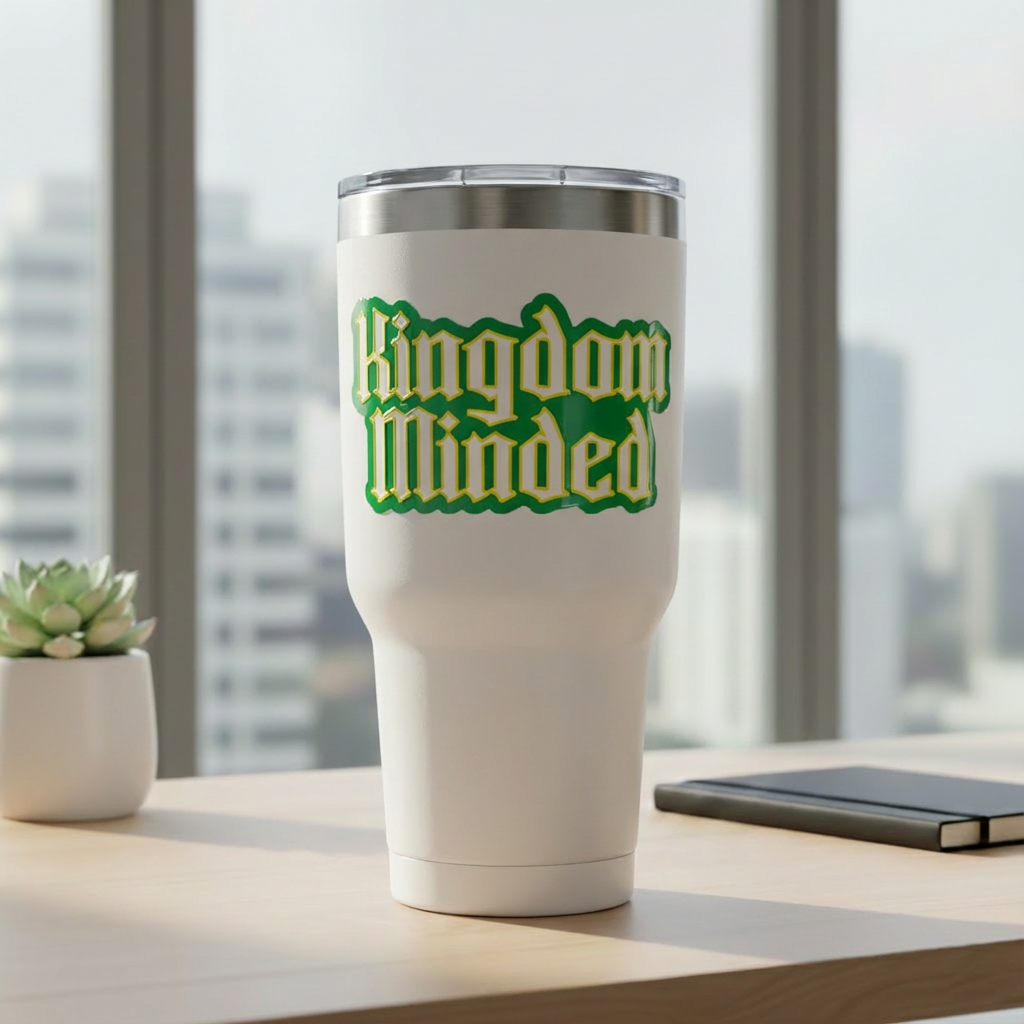 Stay focused on purpose with the Kingdom Minded UV Perma Sticker — a bold declaration for believers who live intentionally for God's Kingdom. Featuring white lettering outlined in gold and green, this design blends strength and style to remind you that your thoughts, words, and actions belong to the King.