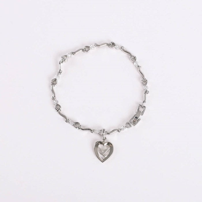 Bracelet-Cubic Zirconia & Heart/Dove Charm-Rhodium (7.25")