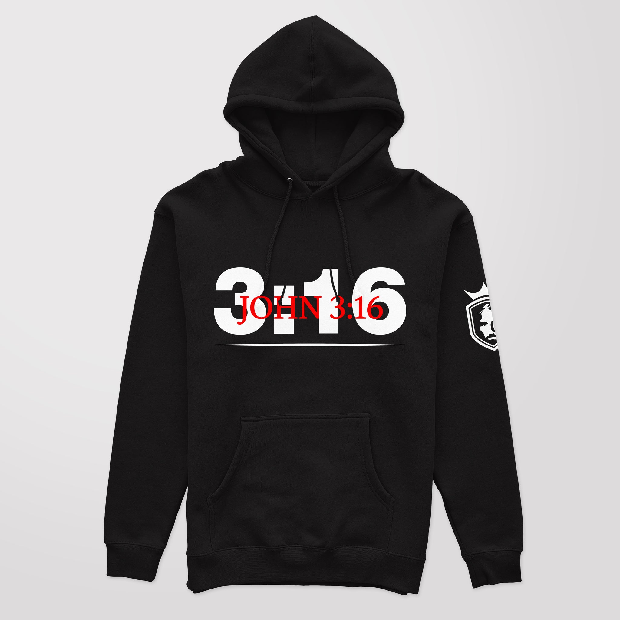 This bold and inspiring hoodie carries a timeless message for everyone, featuring the iconic "John 3:16" scripture prominently across the chest in a striking design. Offered in classic black with your choice of white vinyl with red lettering or silver foil vinyl with red lettering, this hoodie makes a powerful statement of faith while keeping you warm and comfortable.