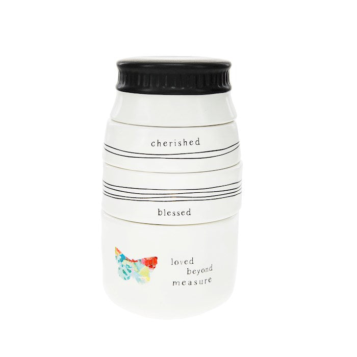 Cherished, blessed, loved beyond measure PREMIUM QUALITY: 6" stackable measuring cup set, packaged in a plain box, is made from stoneware and features four cups measuring 1/4 cup, 1/3 cup, 1/2 cup, and 1 whole cup. IN-HOUSE DESIGN: "Cherished, Blessed, Loved Beyond Measure" text decal is applied to the front of the measuring cup set. PERFECT GIFT: Great for gifting to a friend who loves baking. CARE INSTRUCTIONS: To best preserve decals, washing by hand is recommended. Dishwasher safe. Microwave safe.